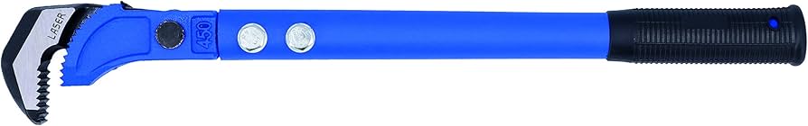 - Pipe wrench type design with quick fit spring loaded jaw.